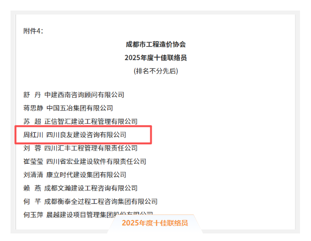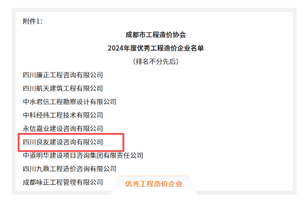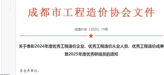 近日,成都市工程造價(jià)協(xié)會(huì)發(fā)布了《關(guān)于表彰2024年度優(yōu)秀工程造價(jià)企業(yè)、優(yōu)秀工程造價(jià)從業(yè)人員、優(yōu)秀工程造價(jià)成果暨2025年度優(yōu)秀聯(lián)絡(luò)員的通知》,我司憑借專(zhuān)業(yè)實(shí)力與突出貢獻(xiàn),斬獲多項(xiàng)殊榮。